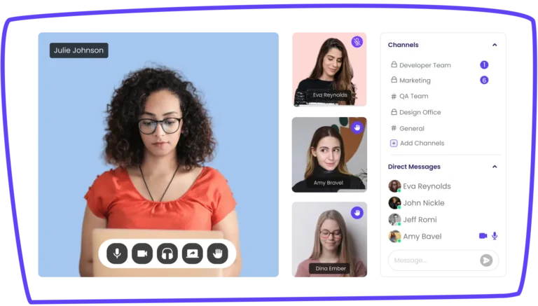 Voice, video, chat, screen sharing, and whiteboards integrated directly into the environment.